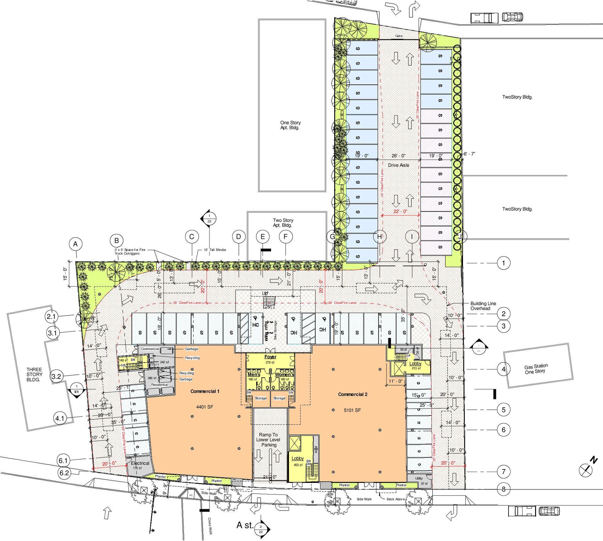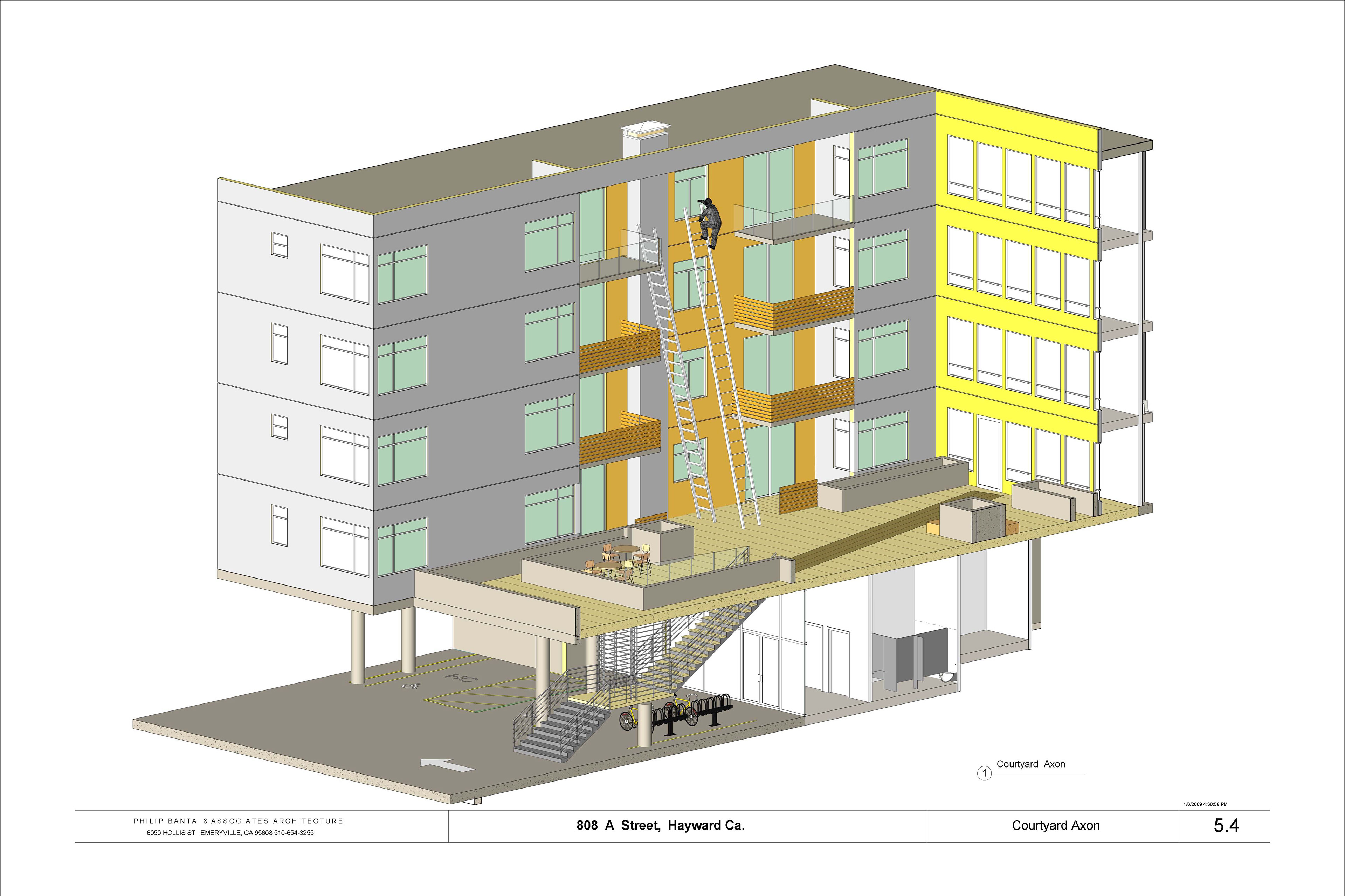 Mix-use 64 unit Residential-Commercial building in the heart of downtown Hayward, CA across from City Hall and public transit. Features podium level court yard to optimize day lighting while providing open space. The court yard also treats storm run-off into filtration planters which are also located along the commercial street facades. Photovaltaic panels are incorporated into trellis's. Involved with schematic, design development, obtained planning permit.