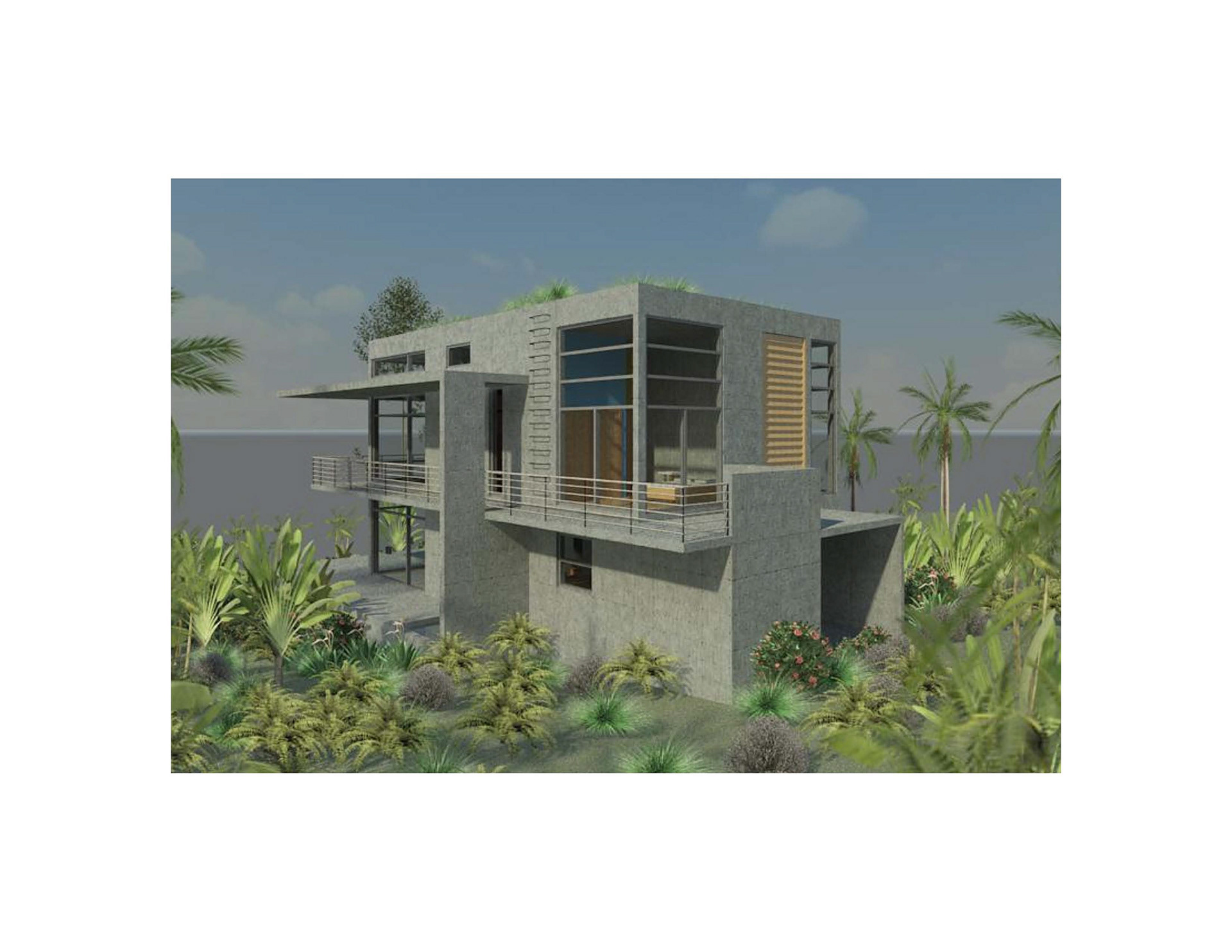 1,800 Square feet Home Featuring: 3 Bedroom, 2 1/2 Bath, Kitchen & Dining, Living, Storage, Concrete Decks & Patios, 1,000 Sq Ft. Roof-scape w/ Gardens, Concrete Walls Roof and Structural system, Wood Siding, Aluminum or Wood Clad Curtain Glazing Panel System, Ext. Sunshades, Bamboo Wood Floors, ,Cooling Ponds + Rain Harvesting.